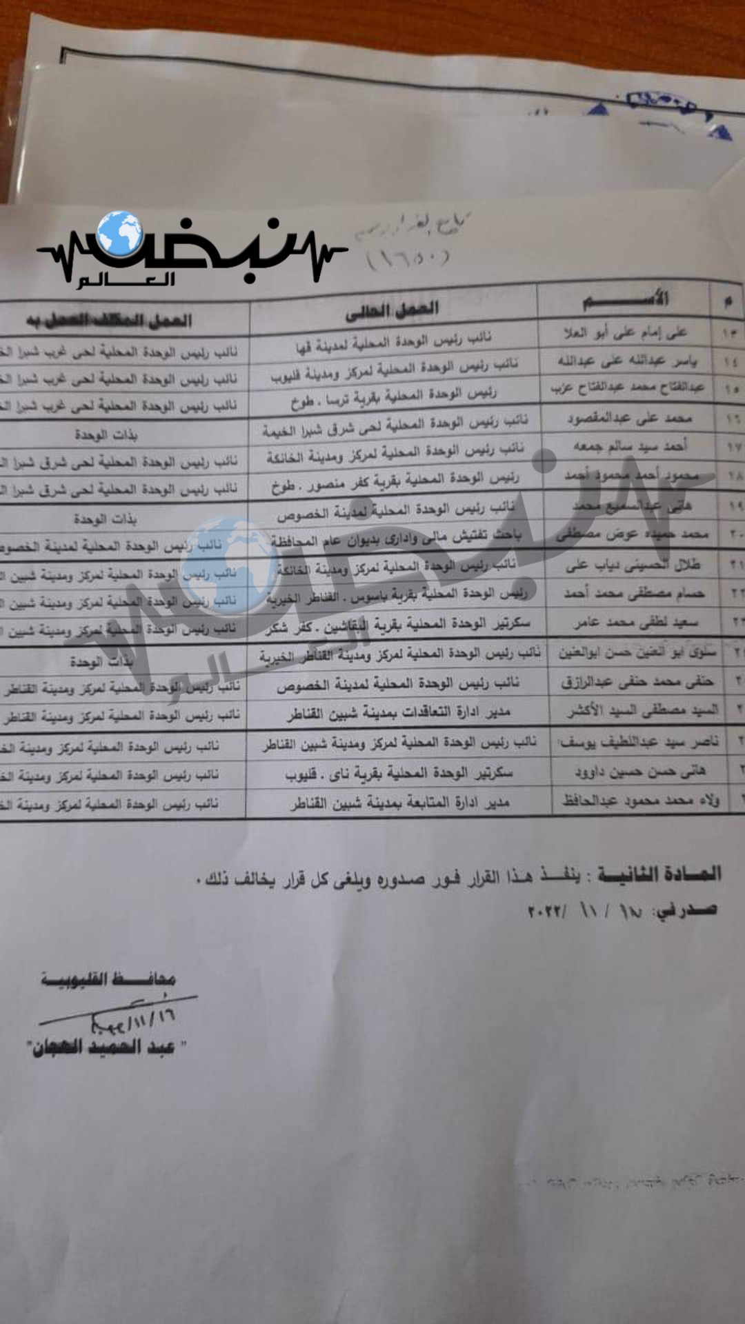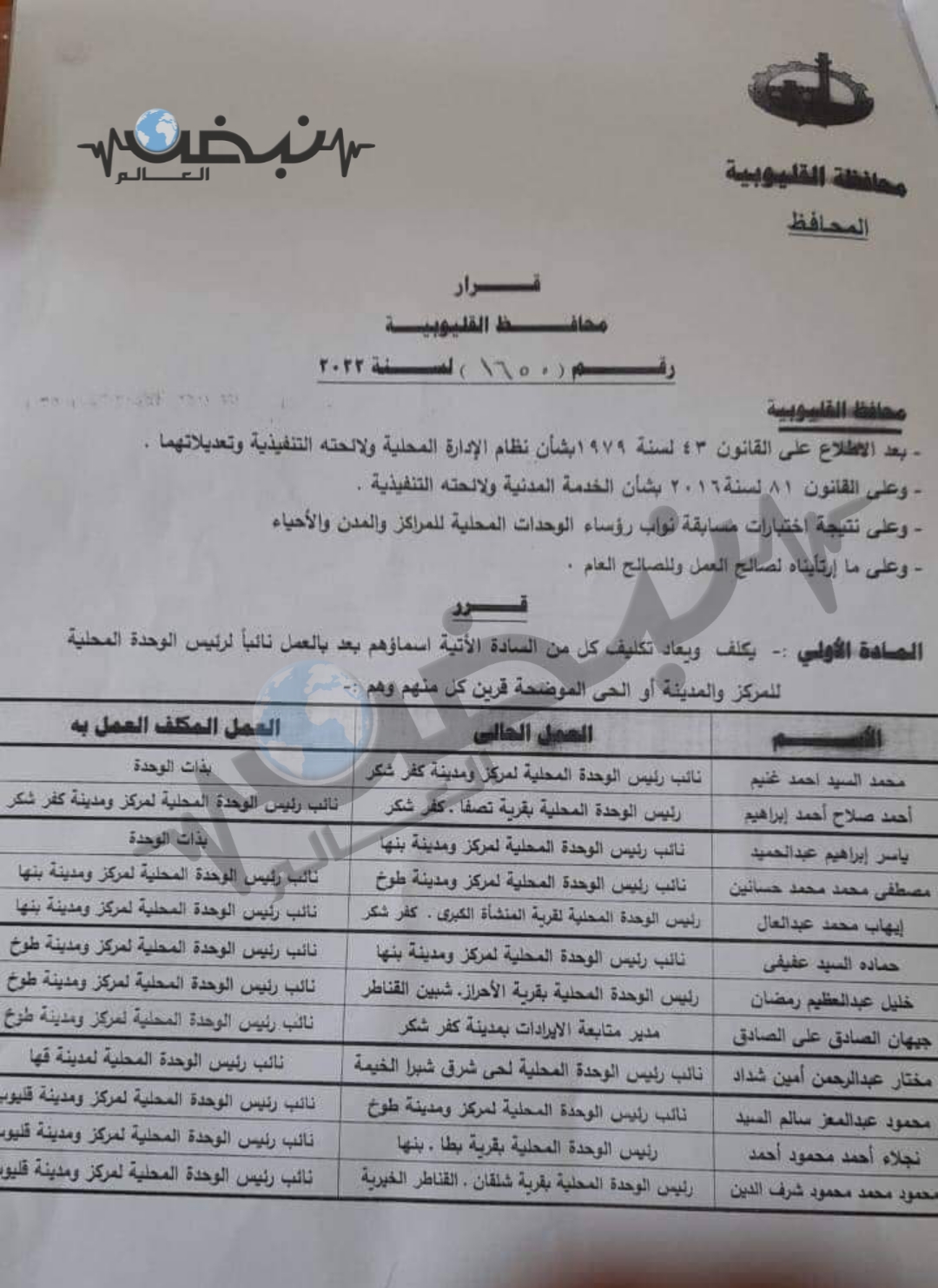 – يكلف نجلاء أحمد محمود أحمد نائباً لرئيس الوحدة المحلية لمركز ومدينة قليوب.