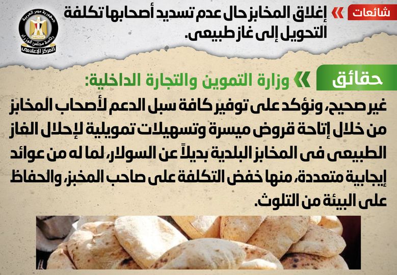 إنتشر في بعض المواقع الإلكترونية وصفحات التواصل الاجتماعي أنباء بشأن إغلاق المخابز حال عدم تسديد أصحابها تكلفة التحويل إلى غاز طبيعي، وقد قام المركز الإعلامي لمجلس الوزراء بالتواصل مع وزارة التموين والتجارة الداخلية، والتي نفت تلك الأنباء، مُؤكدةً أنه لا صحة لإغلاق المخابز حال عدم تسديد أصحابها تكلفة التحويل إلى غاز طبيعي، مُوضحةً توفير كافة سبل الدعم لأصحاب المخابز من خلال إتاحة قروض ميسرة، وتسهيلات تمويلية لإحلال الغاز الطبيعي في المخابز البلدية بديلاً عن السولار، لما له من عوائد إيجابية متعددة، منها خفض التكلفة على صاحب المخبز، والحفاظ على البيئة من التلوث.