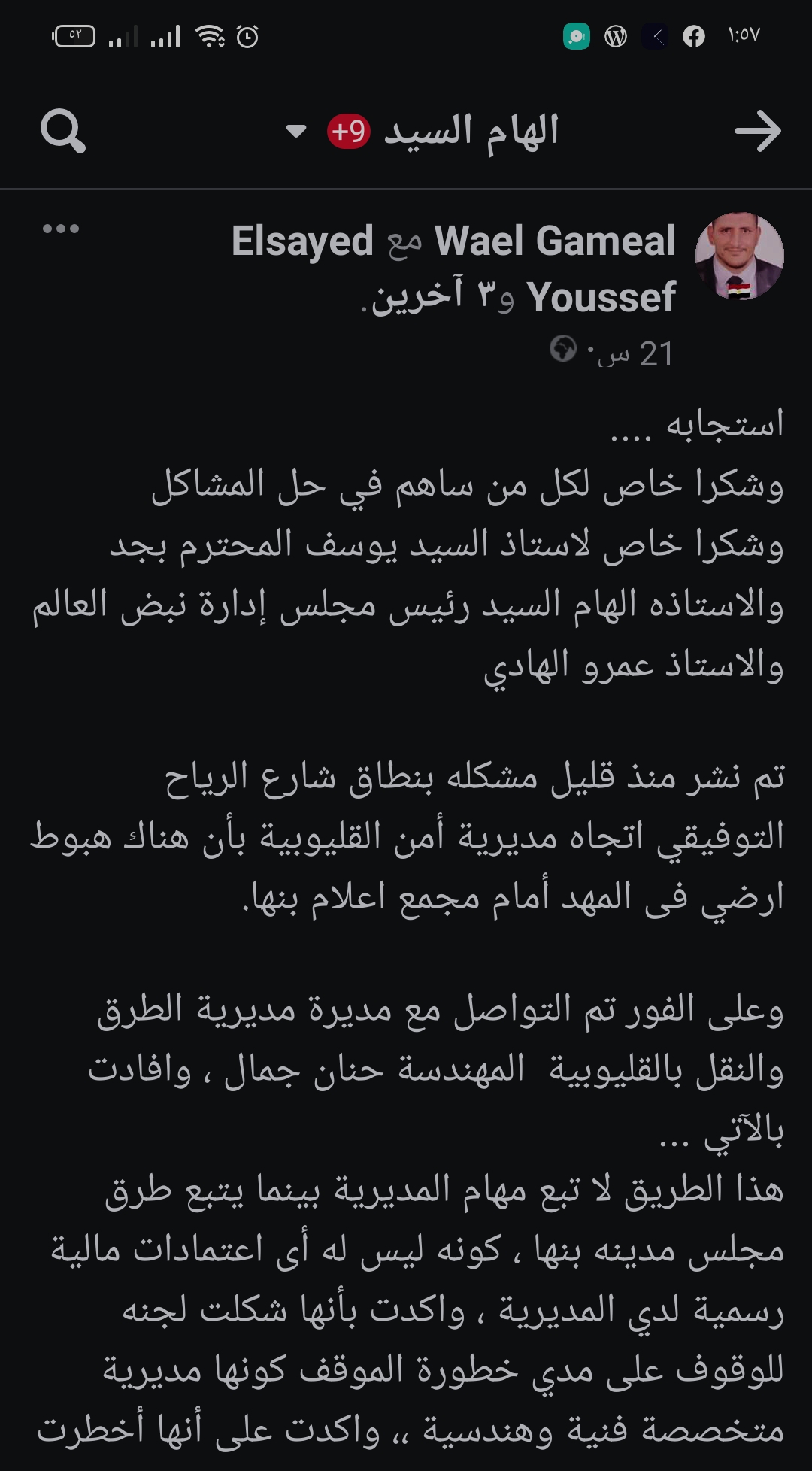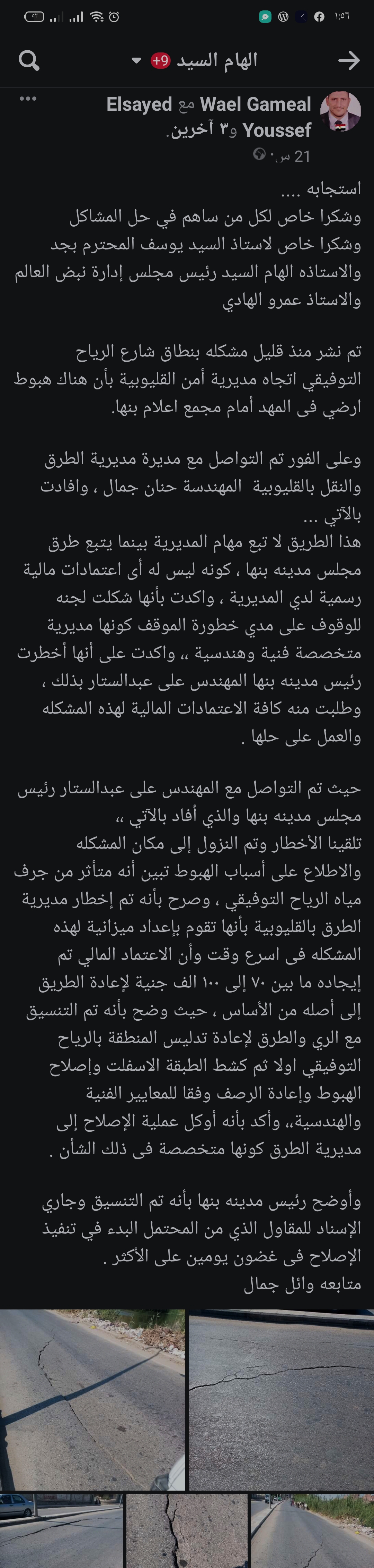 وجاء هذا في استجابة سريعة لما نشره المراسل وائل جمال علي مواقع التواصل الاجتماعي وبتدخل موقع نبض العالم والسيد يوسف مساء أمس، حيث قاما بالتواصل مع المسؤولين بمديرية الطرق والنقل بالقليوبية.