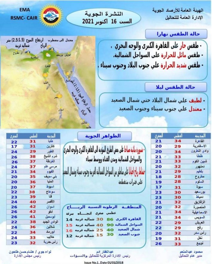أعلنت هيئة الأرصاد الجوية توقعاتها لحالة الطقس غدا ، السبت ، ومن المتوقع أن يسود الطقس الحار نهارا ، علي القاهرة الكبري والوجه البحري ، وشديد الحرارة علي جنوب سيناء ، وجنوب البلاد ، علي أن تنخفض درجات الحرارة ليلا علي جميع أنحاء البلاد .