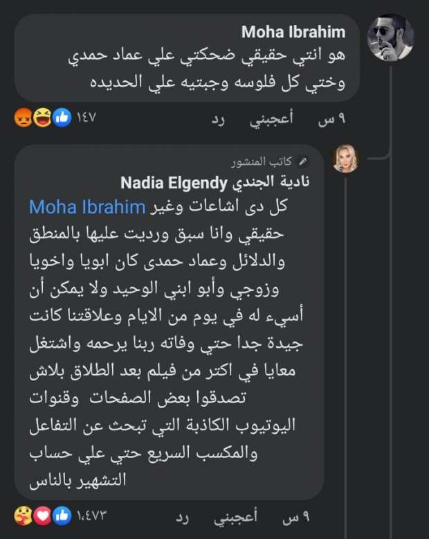 وقامت الفنانة نادية الجندي بالرد عليه، قائلة:«كل دي إشاعات وغير حقيقي، وأنا سبق ورديت عليها بالمنطق والدلائل، وعماد حمدي كان أبويا وأخويا وزوجي وأبو ابني الوحيد».